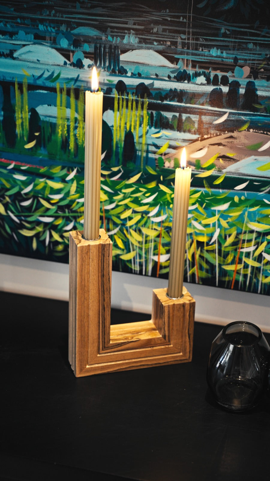 Handcrafted candle holder made from assorted reclaimed wood offcuts. Each piece is shaped and finished by hand, highlighting the natural beauty and warmth of the material